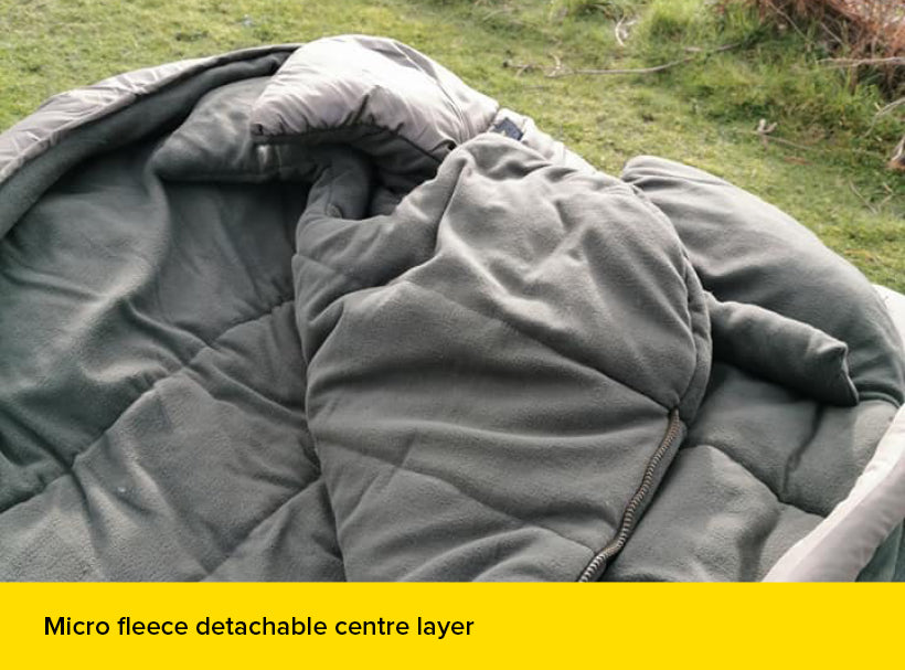 Das einzigartige 50/50-System besteht aus Micro-Fleece im Kopf und Körperbereich, das sich sofort warm anfühlt, während der untere Teil des Schlafsacks aus glattem Rip-Stop-Material gefertigt ist. Die obere Lage schließt die untere perfekt ab.