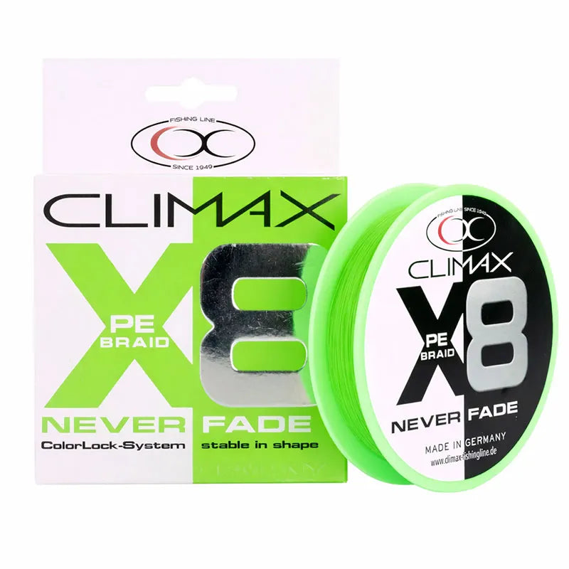 Mit der neuen CLIMAX X8 NEVERFADE bekommst Du endlich eine kompromisslos entwickelte 8-fach geflochtene Schnur, die Farbe, Performance und Haltbarkeit völlig neu definiert.