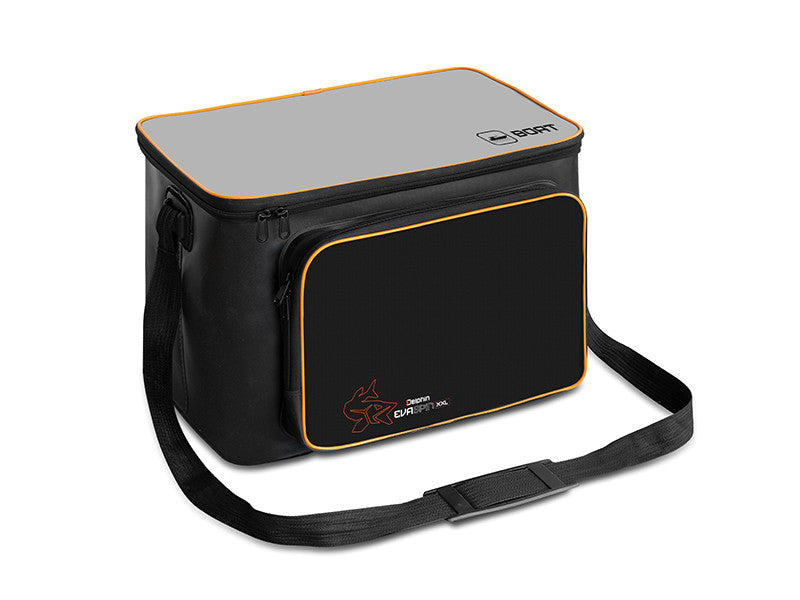 Die EvaSPIN Taschen haben ein modernes Design in einer Kombination aus Schwarz und Grau, das durch die orangefarbenen Elemente wie das Logo mit dem Hecht ergänzt wird. Für einen bequemen und einfachen Transport ist die Tasche mit einem längenverstellbaren Schultergurt ausgestattet.