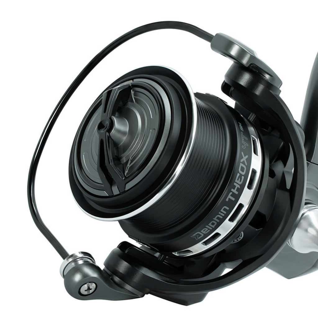 Das elegante dunkle Design mit dezenten silbernen Details macht den Delphin THEOX zu einer Rolle, die zu fast jeder Farbkombination passt. Dank ihrer Zuverlässigkeit und hervorragenden Eigenschaften wird jede Angelsession komfortabler und effizienter.